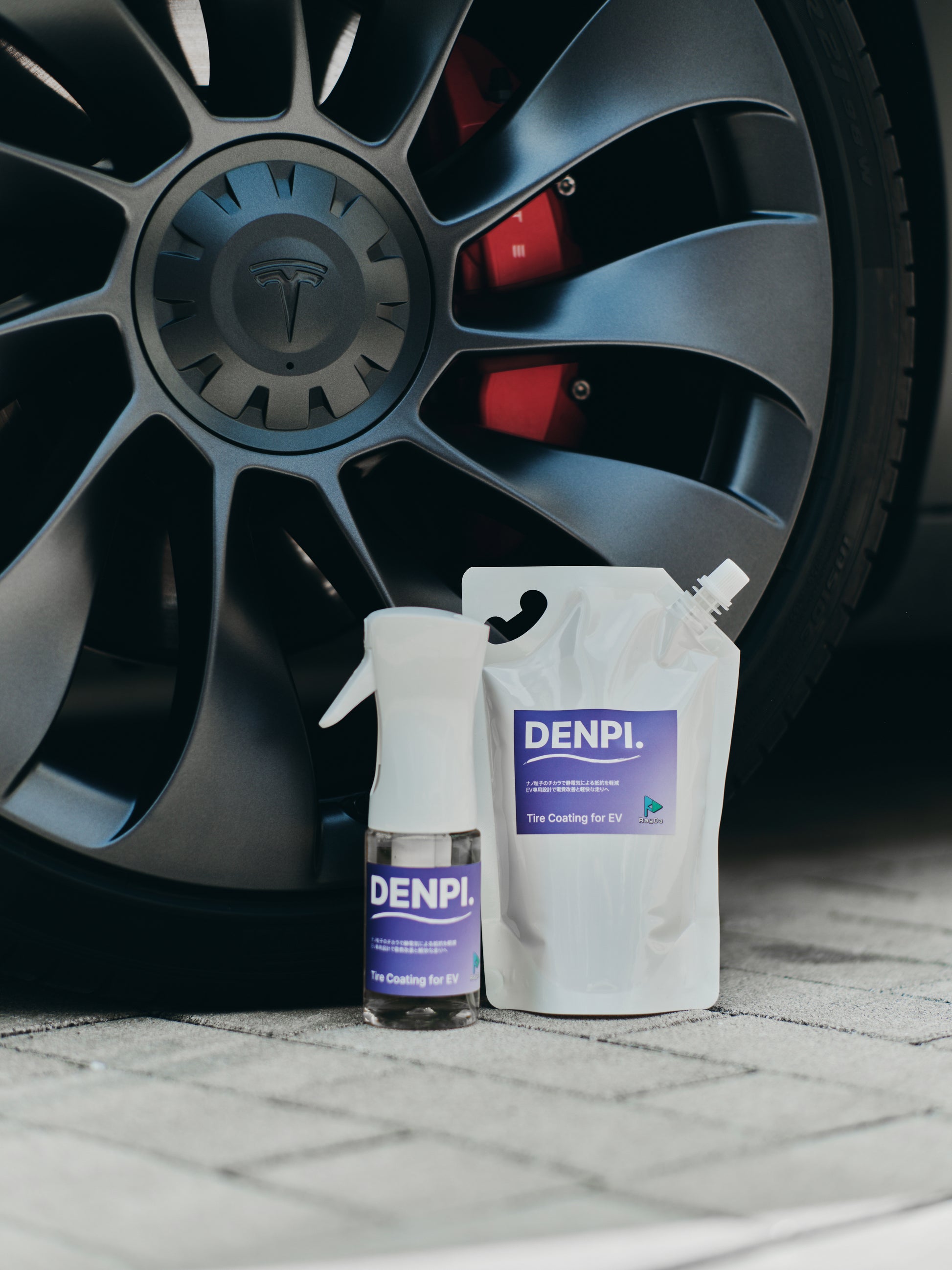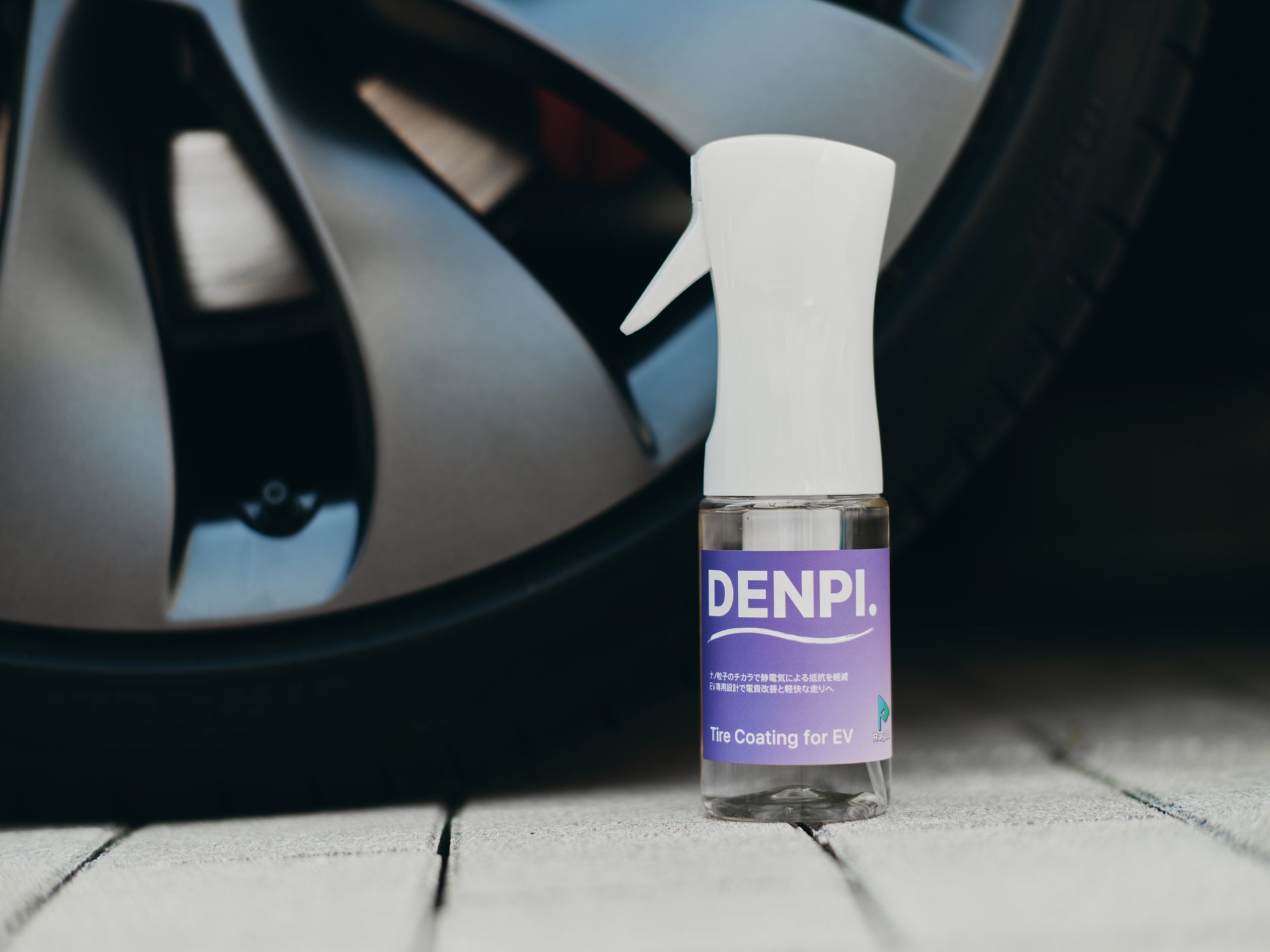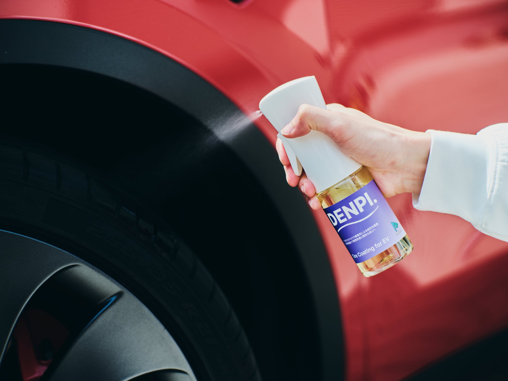 - 前輪はハンドルを切るなどして、できる限りタイヤを露出させてからDENPI.を吹きかけます。